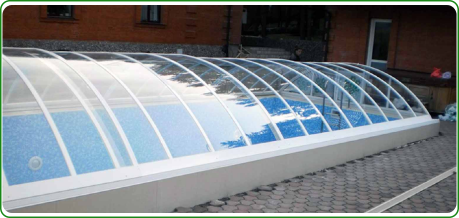 Навесы для бассейна состоят из двойных поликарбонатных плит. Солнечные лучи на протяжении всего дня проникают через их поверхность и, отдавая тепло, обогревают внутри воздух и воду. При этом нет дополнительного обогрева и можно продлить сезон купания, что особенно важно в нашем регионе