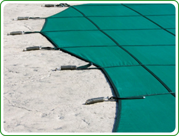 Батутное укрытие ( в основном для зимней консервации), специальный, крепкий, хим стойкий материал, потайные анкера. Такое покрытие работает как мембрана. Оно пропускает дождевую, талую воду и препятствует попаданию пыли, листьев в бассейн. Он выдерживает нагрузку на разрыв до 350 кг/см. Для сравнения: тент похожей плотности на грузовых автомобилях выдерживает нагрузку лишь 65 кг/см. Цена укрытия от 90 000 руб. 9х3,5м